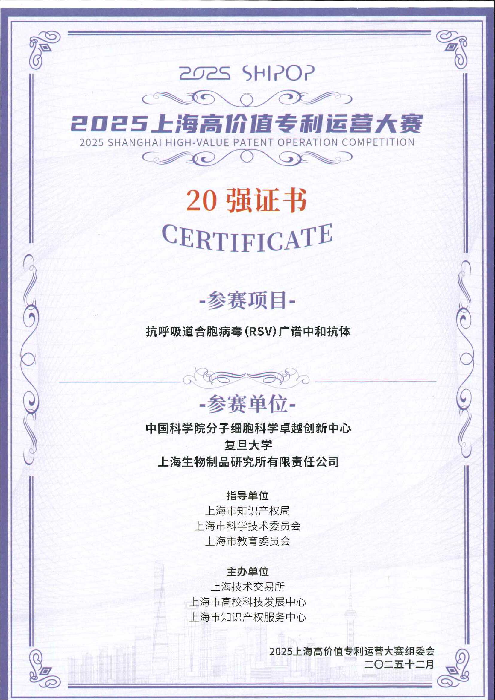 12月25日,上海高价值专利运营大赛(以下简称“上高赛”)决赛暨颁奖典礼隆重举行。由分子细胞卓越中心联合复旦大学合作开发的“抗呼吸道合胞病毒(RSV)广谱中和抗体”项目,凭借技术突破与转化成效,从众多参赛项目中脱颖而出入围二十强,并斩获“专利许可转让奖”。