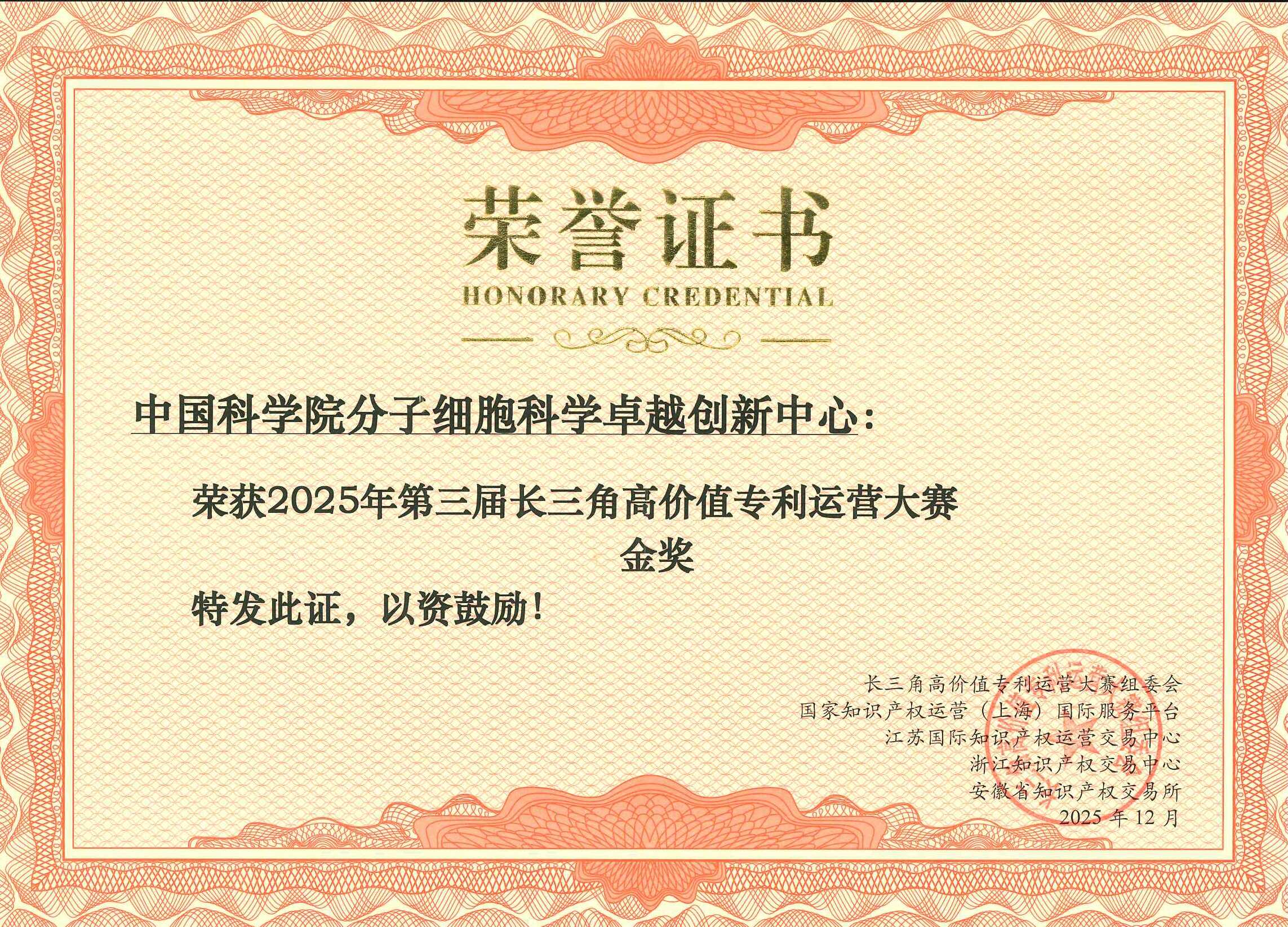 分子细胞卓越中心项目荣获2025年第三届长三角高价值专利运营大赛金奖
